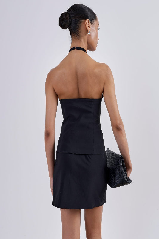 La blusa Amira es sinónimo de elegancia con carácter. Su tono negro profundo y el cuello halter crean una silueta que estiliza y resalta con sutileza, ideal para mujeres que aman lo clásico con un giro moderno.