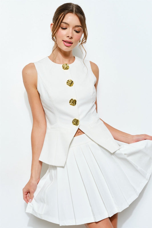 Los botones dorados con textura floral aportan un acento distintivo y lujoso, mientras que su estructura con pinzas frontales y dobladillo en punta define la silueta de forma elegante. Ideal para usar solo o como parte de un conjunto con pantalón sastre.