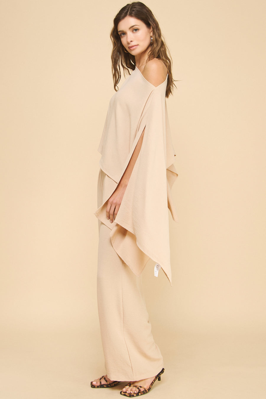 El conjunto Ariadna es la expresión perfecta de elegancia relajada. Su diseño monocromático en tono beige cálido realza la sutileza del movimiento gracias a su blusa asimétrica tipo capa y el pantalón fluido estilo palazzo. Es ideal para mujeres que buscan destacar con discreción y sofisticación en eventos diurnos o noches tranquilas con un toque chic.