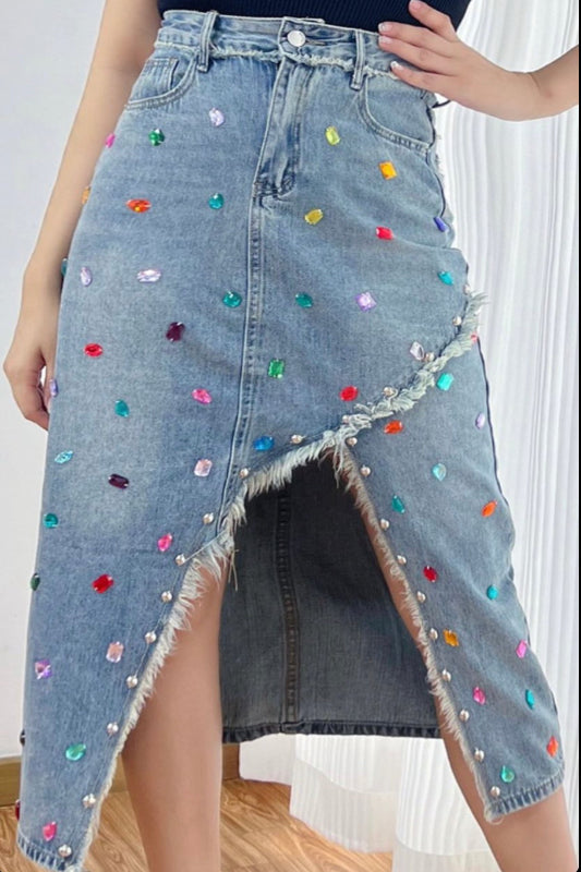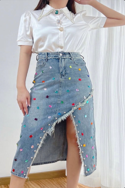 La falda Samira es denim con actitud. Su diseño largo con abertura frontal combina la fuerza de la mezclilla con el brillo sutil de piedras multicolor, creando una prenda original, versátil y con un toque glam que no pasa desapercibido.
