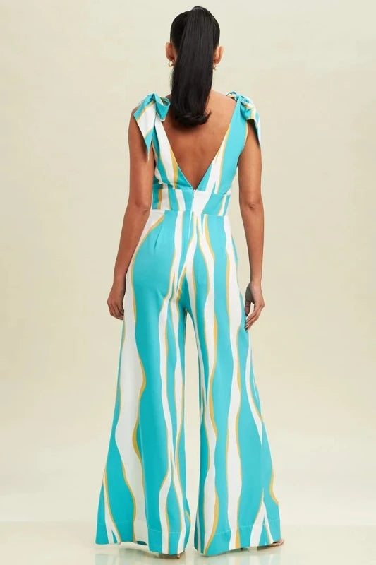 El jumpsuit Haisley es frescura con actitud. Su tono aqua vibrante, combinado con tiras en blanco y amarillo, crea un contraste alegre y chic, ideal para destacar con estilo en eventos de día, escapadas de verano o salidas casuales con un toque sofisticado.