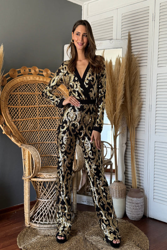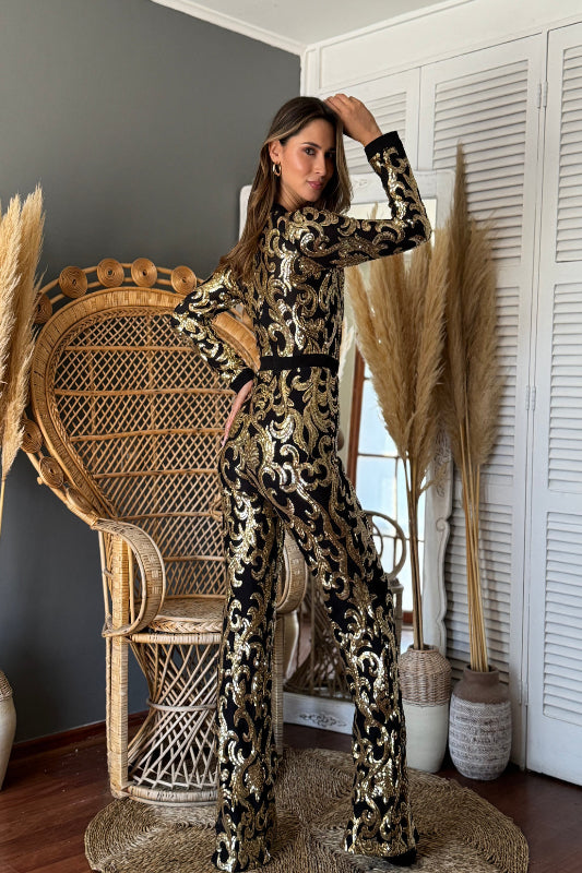 El jumpsuit Solange es una declaración de elegancia y poder. Confeccionado en negro intenso y adornado con grecas doradas, su diseño completo y de manga larga estiliza la silueta con distinción y carácter. Ideal para noches en las que quieres dejar huella.