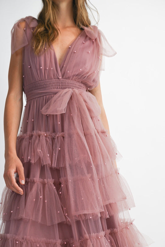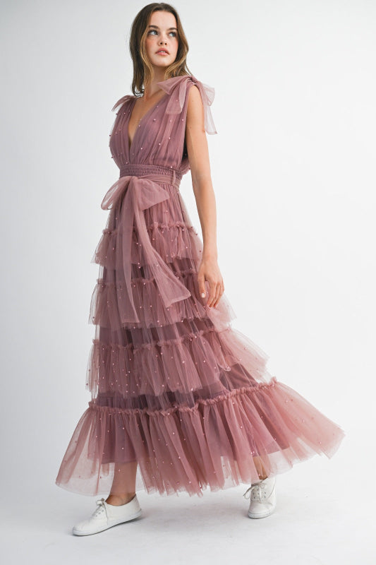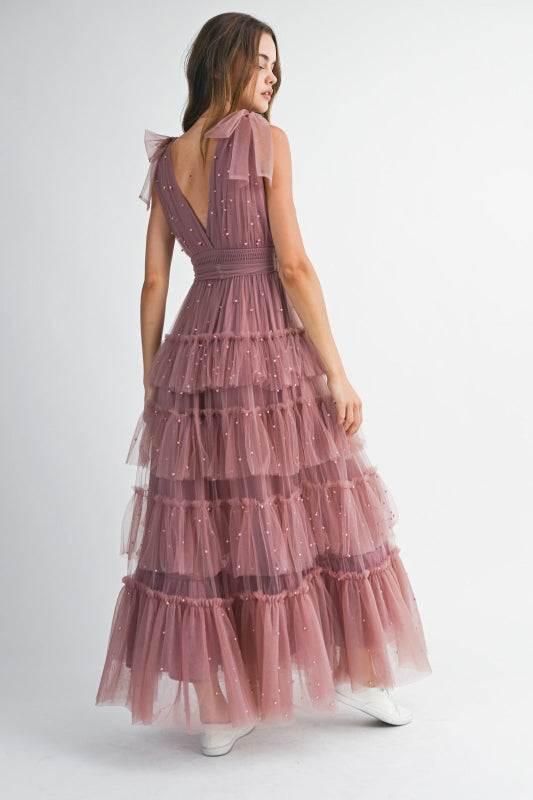 El vestido Domenica es delicadeza en su máxima expresión. Su tono mauve suave y su silueta larga de tul lo convierten en una prenda etérea, ideal para celebraciones donde la elegancia y el encanto se visten de sutileza.