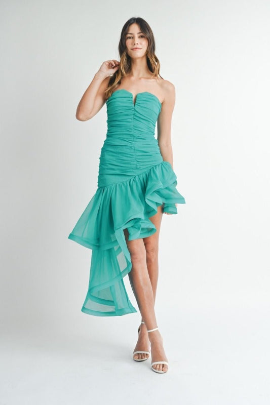 El vestido Halina es frescura hecha elegancia. Confeccionado en tul vaporoso color aqua, su corte asimétrico crea una silueta etérea, fluida y moderna, perfecta para destacar en eventos donde el encanto y la originalidad van de la mano.