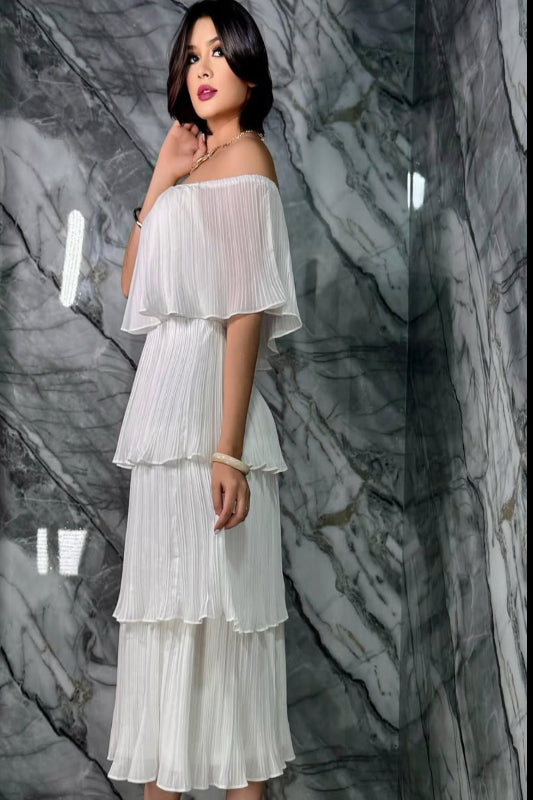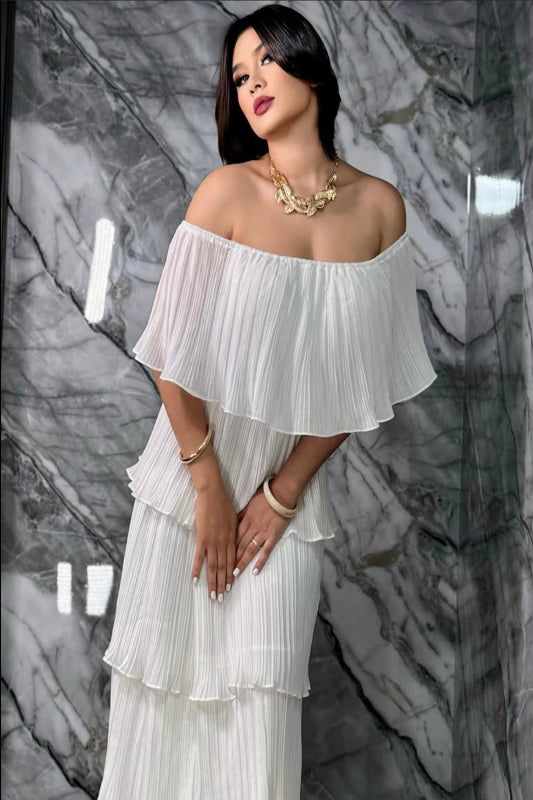 Su confección en plisados ligeros con caída en capas aporta un movimiento fluido y femenino, creando un look etéreo y glamuroso. Perfecto para bodas, eventos de día o celebraciones donde quieras brillar con estilo único.