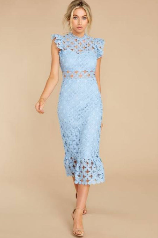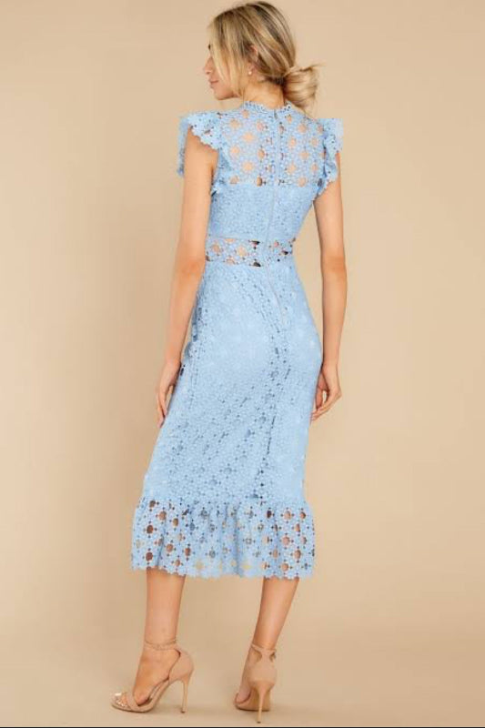 Clásico y encantador, Marisela es un vestido que habla con sutileza y deja huella con elegancia. Su delicado guipiur en tono azul profundo aporta una textura rica y refinada, mientras que su corte recto crea una silueta estilizada, moderna y atemporal.
