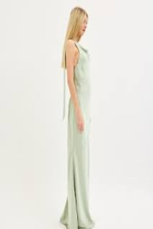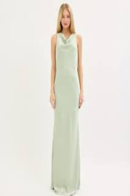 El Vestido Mint Glow deslumbra con su sencillez refinada y acabado satinado que refleja la luz con sutileza. Su tono verde menta transmite frescura y serenidad, mientras que el corte largo y ajustado a la silueta realza la figura con sofisticación.