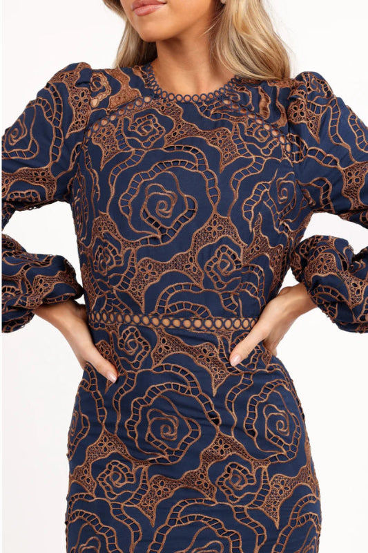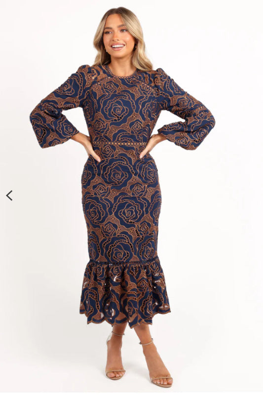 El vestido Salma es la definición de elegancia discreta con carácter. Su profundo azul marino sirve como base perfecta para el bordado en naranja óxido, creando un contraste sofisticado que realza la prenda con sutileza. De manga larga, corte midi y línea recta, es ideal para mujeres que valoran el estilo con presencia.