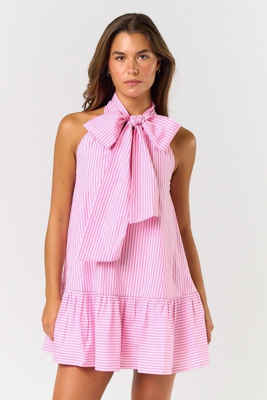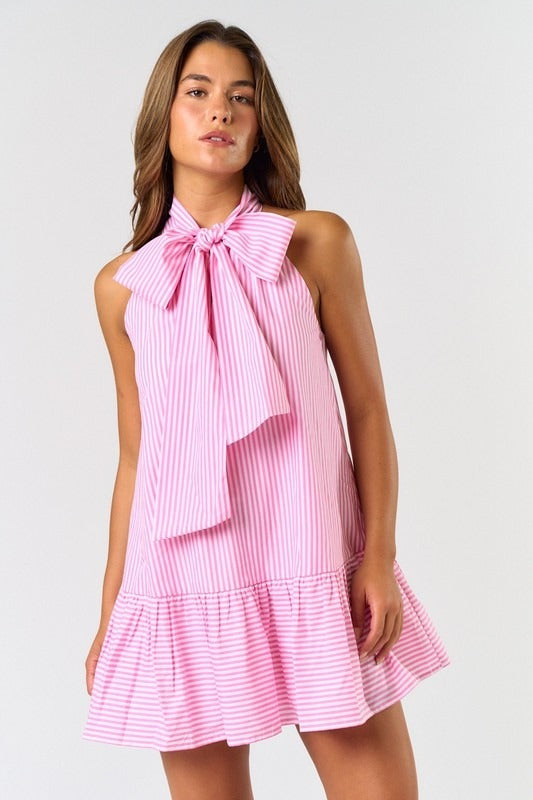 El vestido Ysel es una prenda versátil, fresca y perfecta para la temporada. Con un diseño corto y sin mangas, este vestido ofrece comodidad y estilo para un look casual e informal. Su estampado de rayas rosas verticales estiliza la figura, mientras que el detalle de moñito tipo corbata en el cuello le da un toque femenino, coqueto y único.